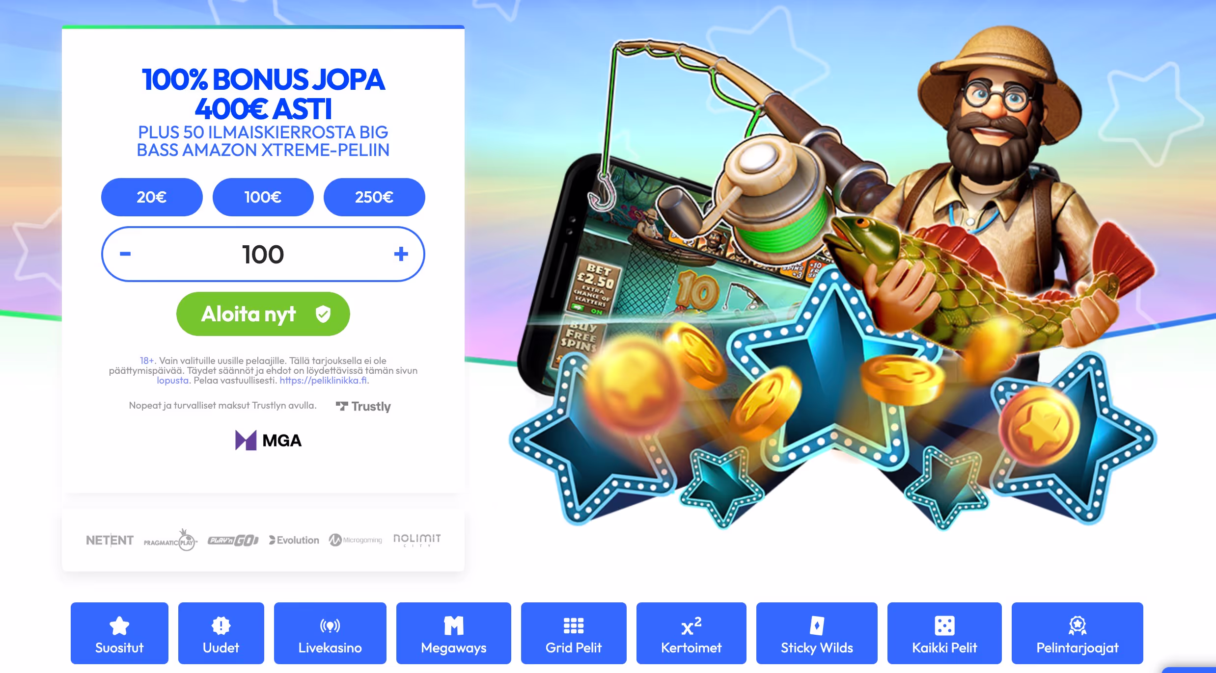 Uusille pelaajille tarjoamme tervetuliaisbonuksen: 100% bonus aina 400€ asti sekä 50 ilmaiskierrosta Big Bass Amazon Xtreme -peliin.